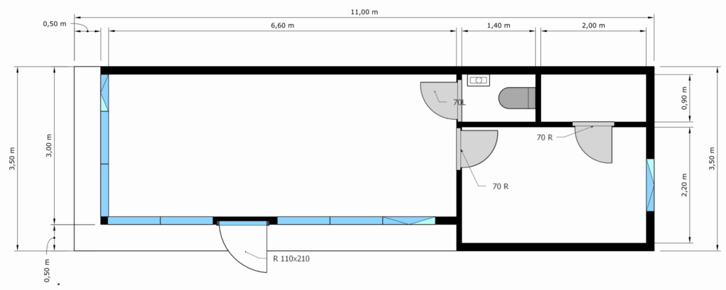 Modulhuset Elegance är en kompakt och praktisk lösning som erbjuder en smart planlösning för både arbete och vardag. Huset består av en rymlig huvudsal, ett separat kontor, ett badrum och ett arkivrum. Tack vare sin genomtänkta design passar det perfekt som kontorsbyggnad, ateljé eller mindre bostad. PIR-panelkonstruktionen garanterar utmärkt isolering och hållbarhet.